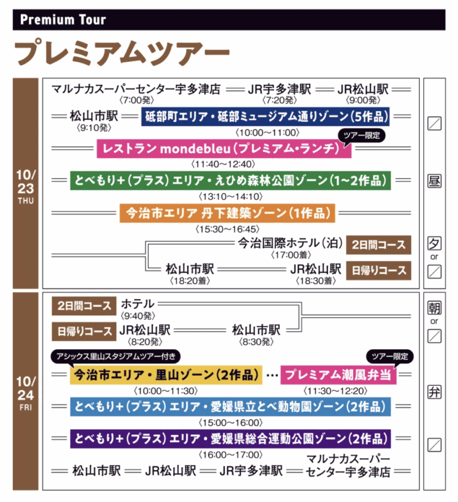 10月23日・24日の2日間に渡って開催されるプレミアムツアーでは、とべもり+(プラス)エリアの4ゾーン、砥部町エリア、今治市エリアの2ゾーンをフェスのコミュニケーションディレクター 二宮敏と巡り観る人から感じる人へワンランク上のアート体験ができる、とっても魅力的なツアーです。
