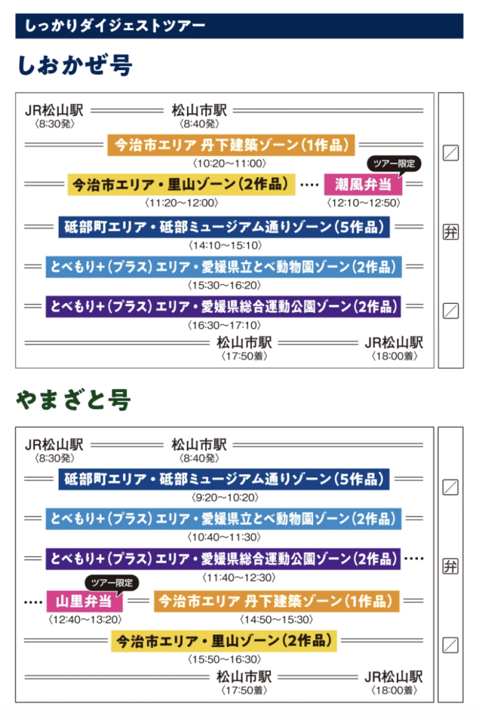 10月18日と11月1日に開催されるダイジェストツアーでは、とべもり+(プラス)エリアの2ゾーン、砥部町エリア、今治市エリアの2ゾーンの要所を効率よく巡るコンパクトなツアーです。ガイドによる見どころをギュッと凝縮した説明を聞きながら作品をお楽しみいただけます。