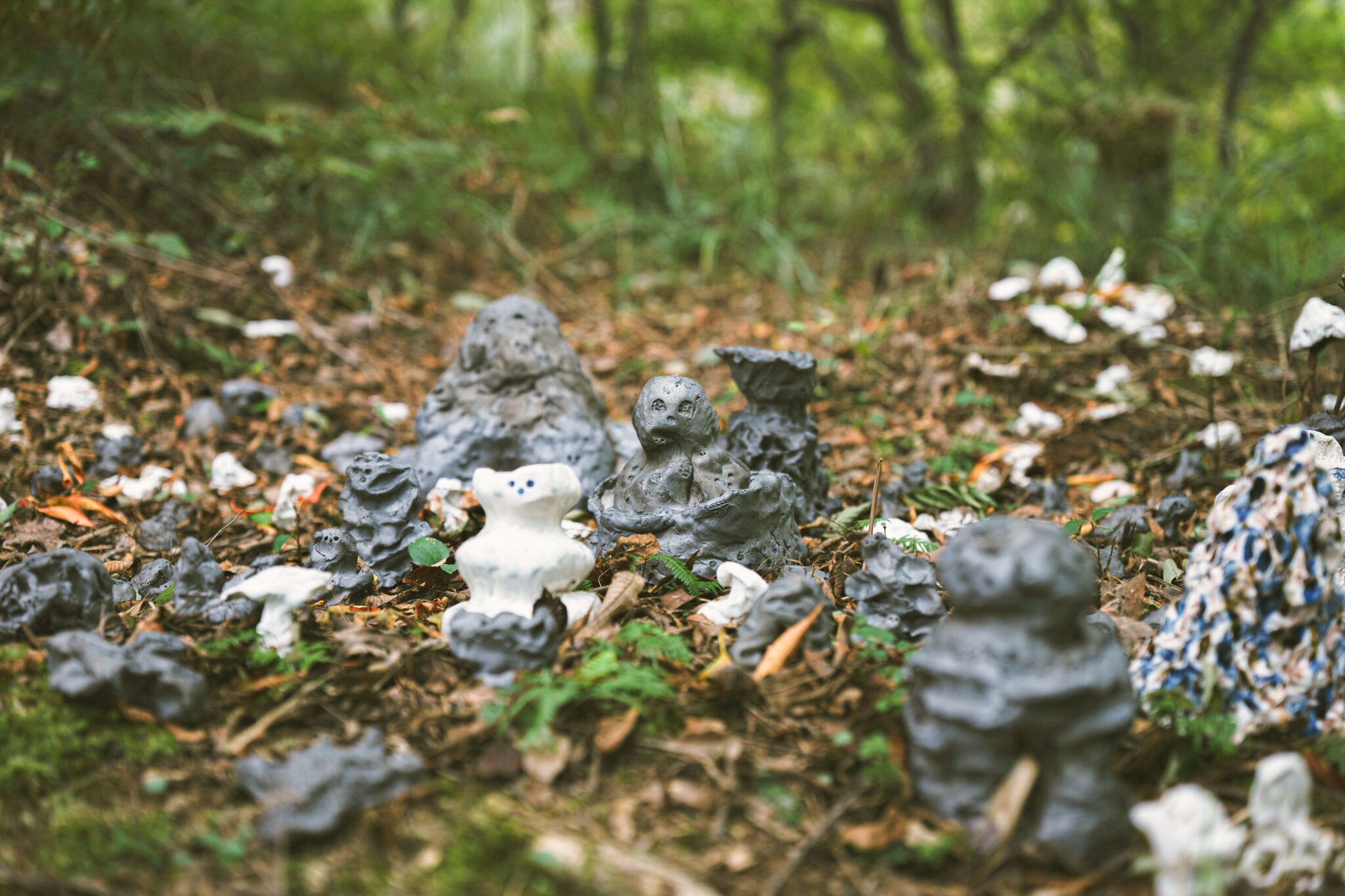 愛媛の伝統工芸品である菊間瓦と砥部焼の粘土を使い制作。山に生息している植物、菌類、虫、動物等とオブジェ、私また鑑賞者が個々にあるようでいて全ては繋がっている。それを体感しながら山の一部、作品になってもらう。