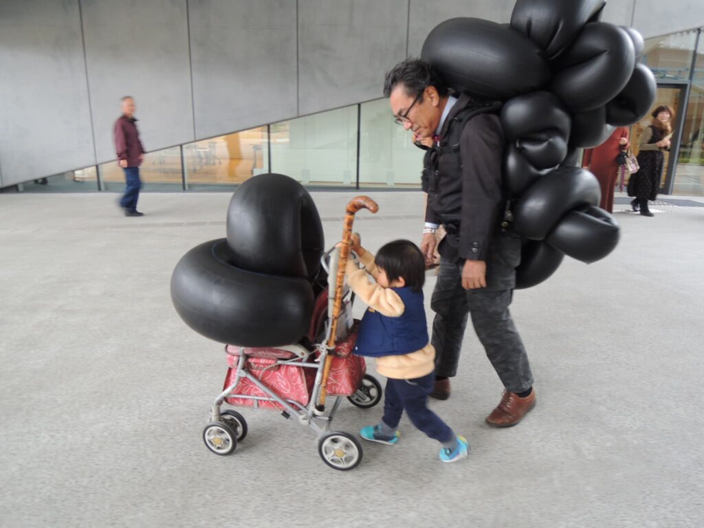 人生の重さをカラダで感じてみよう!はちきれんばかりのエネルギーに満ちたゴムチューブのオブジェ「重い荷物」を背負ったり、カートに乗せて押したり。大人だってこどもだって老人だって、生きていくのはたいへんだ。でも不思議。背負うとなぜか笑顔になる。