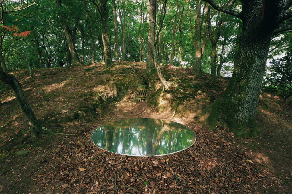 1500年の時を越え、古墳の森に現れる鏡。空や木々、人々を映し、波紋のように揺らめかせる。 かつての夢「水の上を歩く」ような体験を、次世代の子どもたちに叶えてみたい。