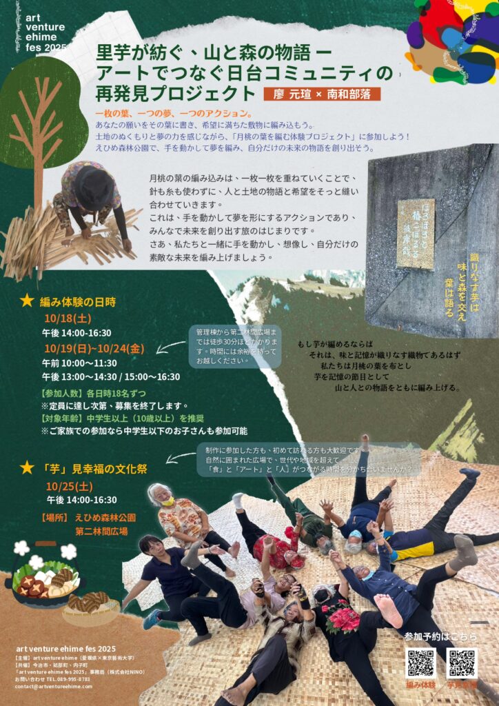 台湾のパイワン族の創作者たちとともに、 愛媛の森で「山林生命の敷物」を編みましょう。月桃を編みながら、山と海と人との対話を紡ぎ、 国境も世代も越えて、文化と芸術の体験が始まります。