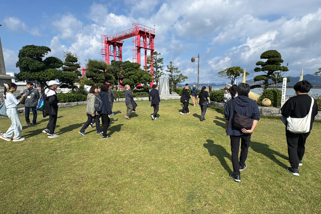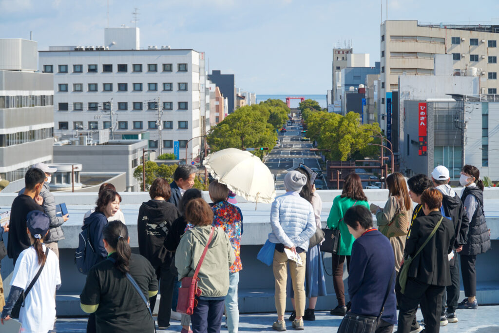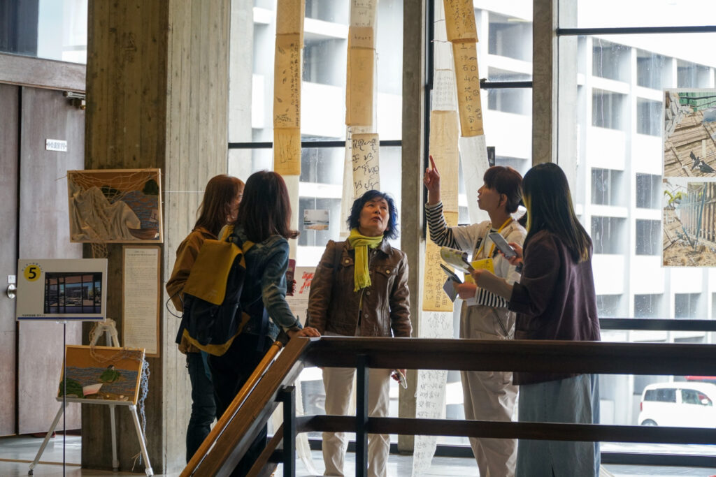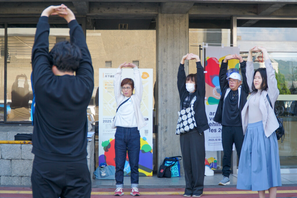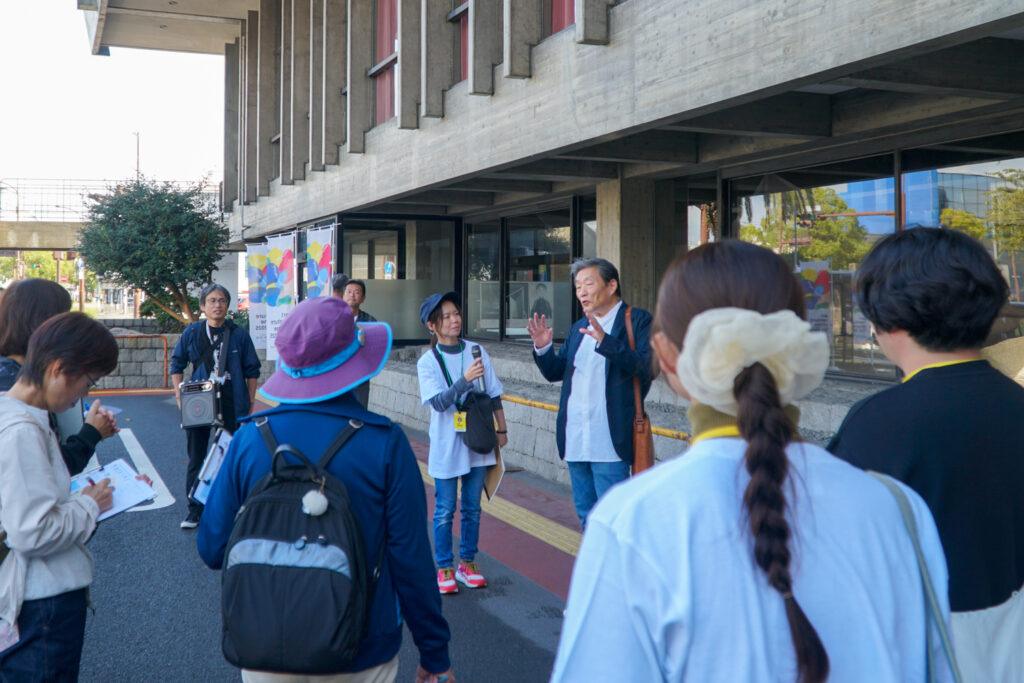 これまでの講座では、丹下建築についてリサーチを行ったり、「ここにある豊かさ」という視点で地域を見つめながら、ひめラーによる丹下建築ツアーの企画をそれぞれのチームごとで話し合いながら、内容を形にしていきました。今回はその実践の場です。art venture ehime fes 2025の会期中ということもあり、多くの来場者の姿が見られる中、3つのツアーやワークショップが行われました。