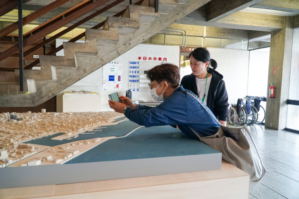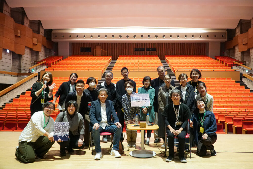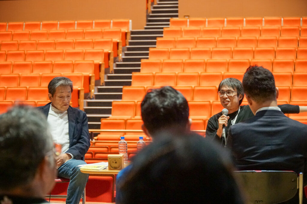 他にも、大野順作さんと今治市文化振興課の田中謙さんによるクロストークを開催し、みんなで今治の丹下建築の魅力について語り合う時間となりました。舞台横の柱に残るコンクリートの木目に触れながら、素材の質感を確かめる参加者の姿も見られました。