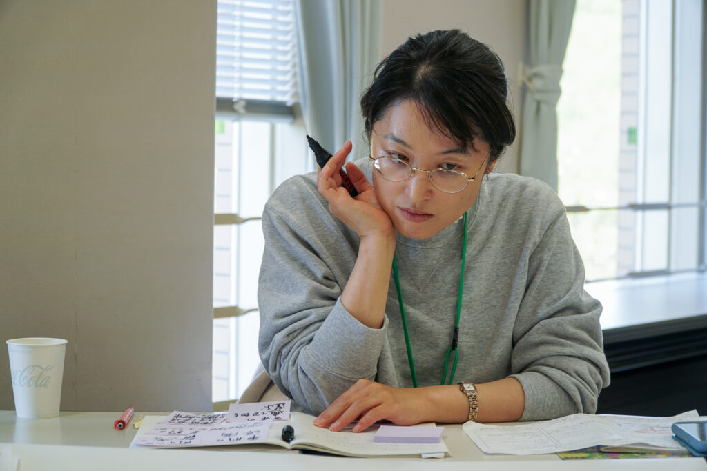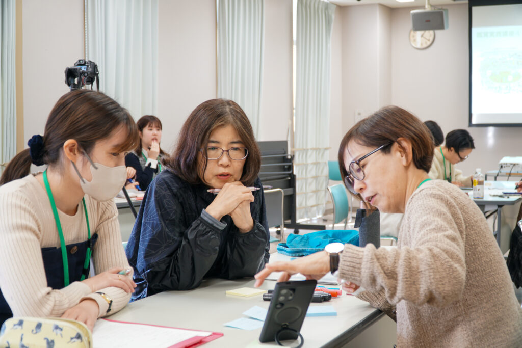 まずは、ファシリテーションを行ってきたグループに分かれ、ひとりひとりがこれまでに行ったファシリテーションの気付きを整理し、情報交換をしていきます。さらにその気づきをグループでまとめて全体にシェアし、「作品との距離感や立ち位置を気をつける」、「作品のことを知る、見ておくなど事前の準備が必要」また「他の来場者への配慮」など、対話型鑑賞をファシリテートするための具体的な内容がグループ内で共有される中、春日さんからは、「地域や社会に出た場合、対話型鑑賞の手法をどのように活用できるかという点も踏まえて振り返りをしてみてください」というコメントがあり、さらにひめラーたちの議論が深まっていきました。