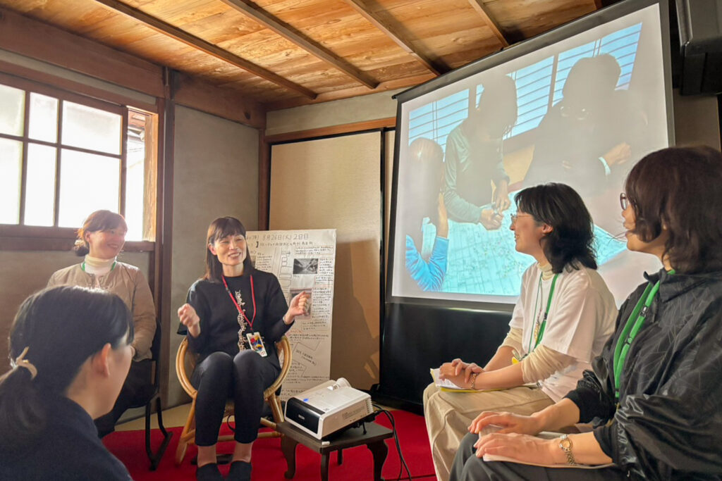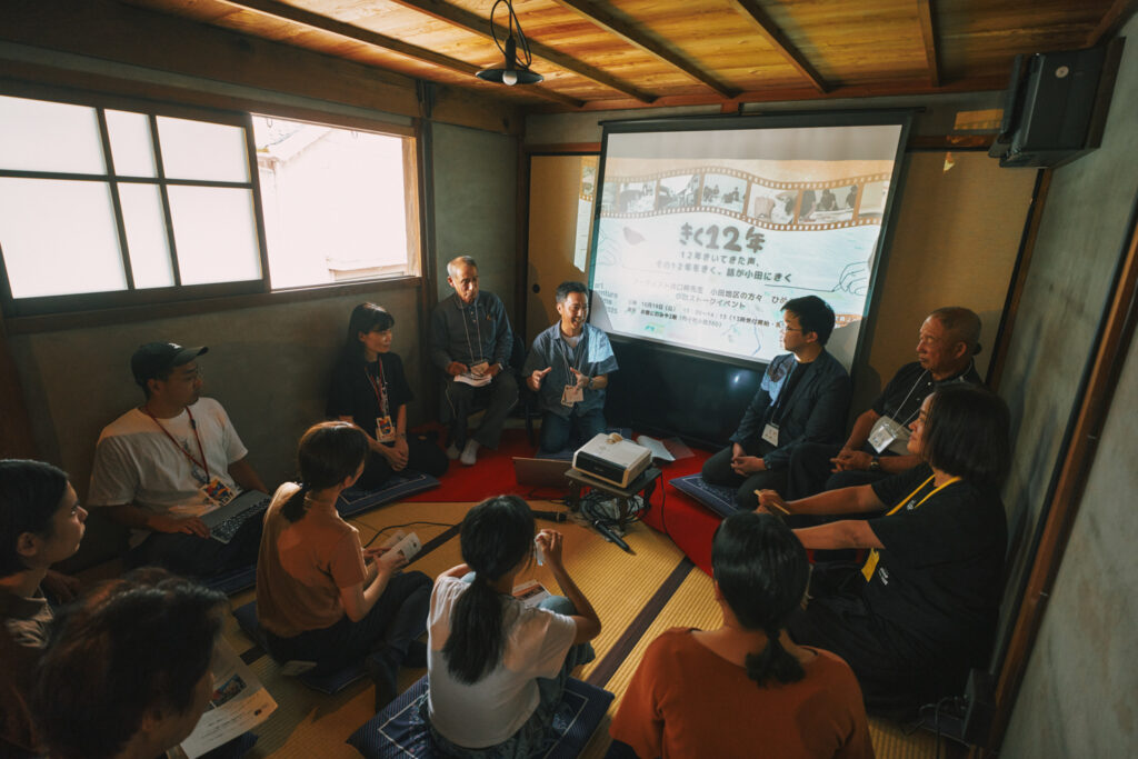 講師の井口さんが12年かけて地域で聞き取ってきた歴史をまとめた作品『つむぐ』が展示される会場にて、当時を知る地域の方や卒業生が集まり、これまでの歩みを振り返りました。